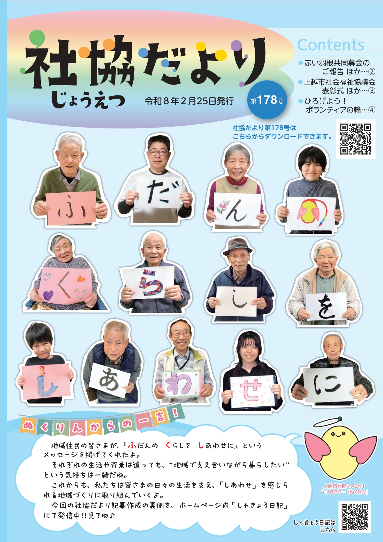 一覧を見る おしらせ 2026.03.03上越支所だよりを発行しました! おしらせ 2026.02.27大浦安だより第6号を発行しました。 募集 2026.02.26令和8年度要約筆記講習会の受講生募集 おしらせ 2026.02.25デイサービスの昼食紹介動画を掲載しました おしらせ 2026.02.25社協だより178号を発行しました。 おしらせ 2026.02.13あなたもホームヘルパーになりませんか? 募集 2026.02.13シニアカレッジ新潟 令和8年度学生募集 最新情報 2026.01.07「想いを描いた創作展」の開催お礼、「スライドショー」動画の掲載 ご案内 2025.12.26すこやかサロン春日 開催予定表 おしらせ 2025.12.26なだち支所だより第59号を発行しました。 ご案内 2025.11.03「想いを描いた創作展」を開催します 募集 2025.10.27「権利擁護支援者養成講座Ⅰ」のご案内 X はこちら Facebookはこちら YouTubeはこちら YouTube 配信中! しゃきょう日記 社協だよりができるまで③ さて、前回に引き続き、2月号の表紙を飾っていただいた方をご紹介します! 柿崎区にある「ふれ… 一覧を見る 各支所のご案内 本所 上越支所 安塚支所 浦川原支所 大島支所 牧支所 柿崎支所 大潟支所 頸城支所 吉川支所 中郷支所 板倉支所 清里支所 三和支所 名立支所 デイサービス・ショートステイの空き情報はこちら 社協だより 共同募金のご案内 寄付の受付 苦情相談 入札契約のご案内 職員募集のご案内 会員募集 広告枠のご利用について 助成金情報 製品のご案内 わたしノート(エンディングノート)のダウンロード 研修事業者情報 上越市地域福祉活動計画について掲載いたしました。詳しくは下記をご覧ください。 第2次上越市地域福祉活動計画 第2次上越市地域福祉活動計画 (概要版)※作成中 第2次上越市地域福祉活動計画(リーフレット)