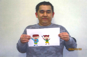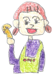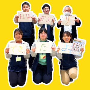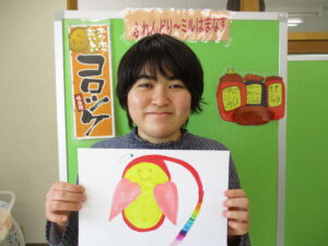 「教えて!社協さん」コーナーでも掲載したミルジャム、ミルコロの製造やシーツの洗濯などのお仕事を頑張られています。イラストを描くことがお好きで、写真の「の」の字は、ぬくりんを合体させてかわいくアレンジされていますね!