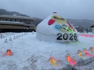 安塚区で行われた、冬の風物詩である灯の回廊(通称:安塚キャンドルロード)についての活動報告です。今年も雪の恩恵を賜りながら、肌身に染み渡る寒さを感じる中、灯の回廊の開催に協賛し雪像を作成しました。2月28日(土)の夕方から安塚区全域でろうそくに灯りがともされ、時に灯りが風にたなびくその光景は、まさに雪の華とも表現ができ、生命の鼓動さえも感じさせられました。安塚支所では、マスコットキャラクターである「ぬくりん」と冬季オリンピックの「五輪」を模して、雪像を作成しました。当日の天候は、あいにくの雨でしたが、蛍光色に彩られた灯篭やご利用者の想いが描かれたコップがより華やかに彩りを添えていました。