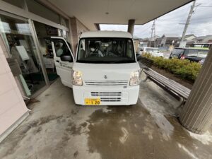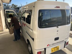 赤い羽根のロゴが入った送迎車が入り、日々ご利用者様の所へお迎えに行っております。